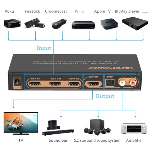 iArkPower 3x1 HDMI Switch with Optical SPDIF & RCA L/R Audio Out, 3 Port HDMI Audio Extractor Splitter with Remote, Supports ARC, MHL, 4kx2k, Full 3D, 1080P