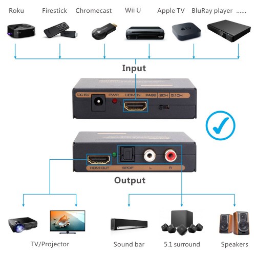 solution for amplifiers or receivers that do not have HDMI inputs, and suitable for various HDMI source devices that do not have dedicated audio output, such as Roku, Chromecast, Blu-ray/ DVD/ HD player,